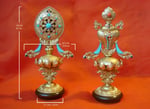 Here is an incredibly high quality set of the 8 Auspicious Symbols (Ashtamangala) for Buddhist Center altar, personal altar, or as an offering gift to you teacher. The ornate detail on these is simply astounding. All metal base and designed with Bronze gilt. The size overall is "medium." They are 16cm (6.3 inches) tall and 8.5cm (3.35 inches) at their widest point. They are heavy in the hand for their size as a reflection of the excellent build quality. The bottom of the round base is 5.1cm (2 inches) wide. These will a powerful condition and support to your practice.