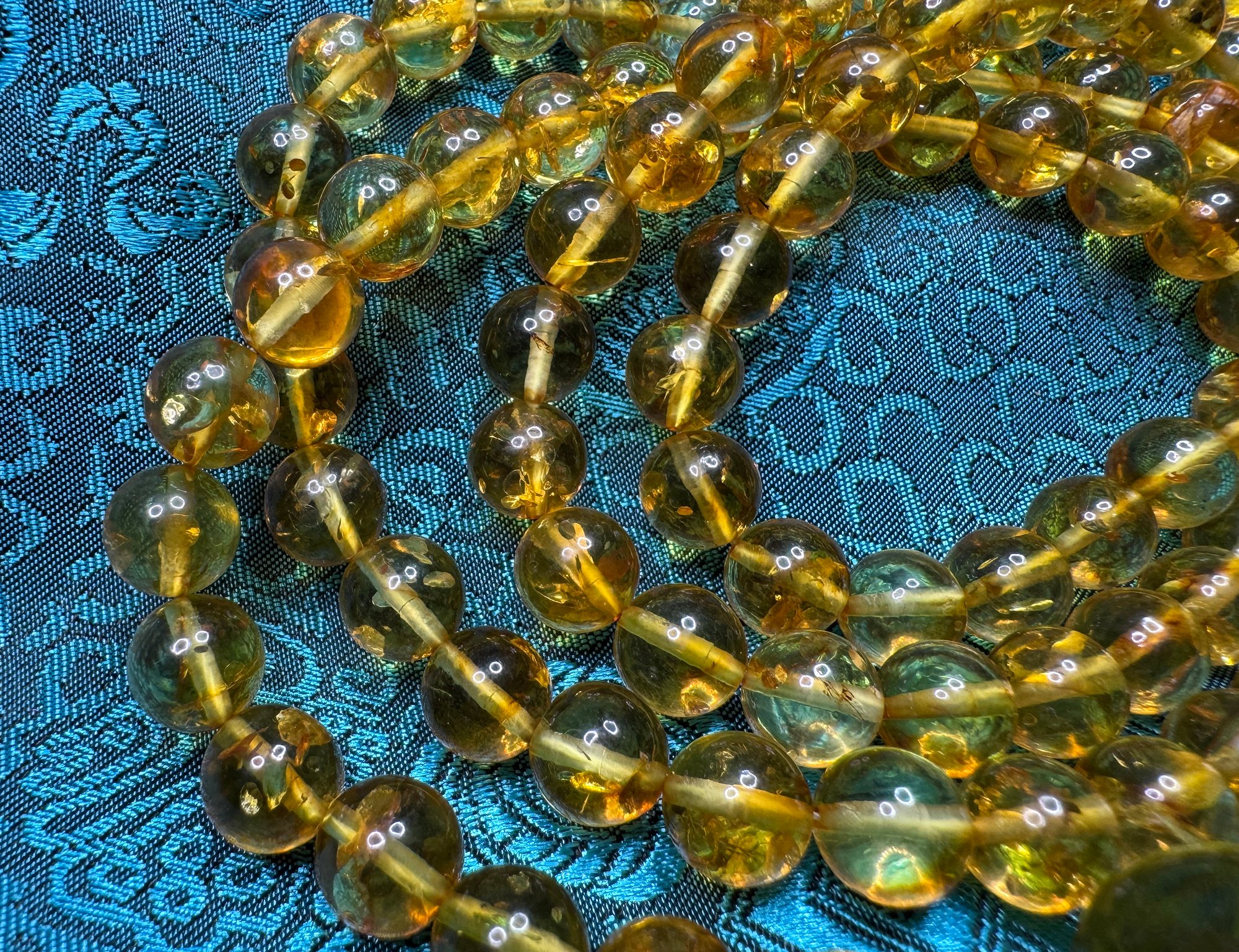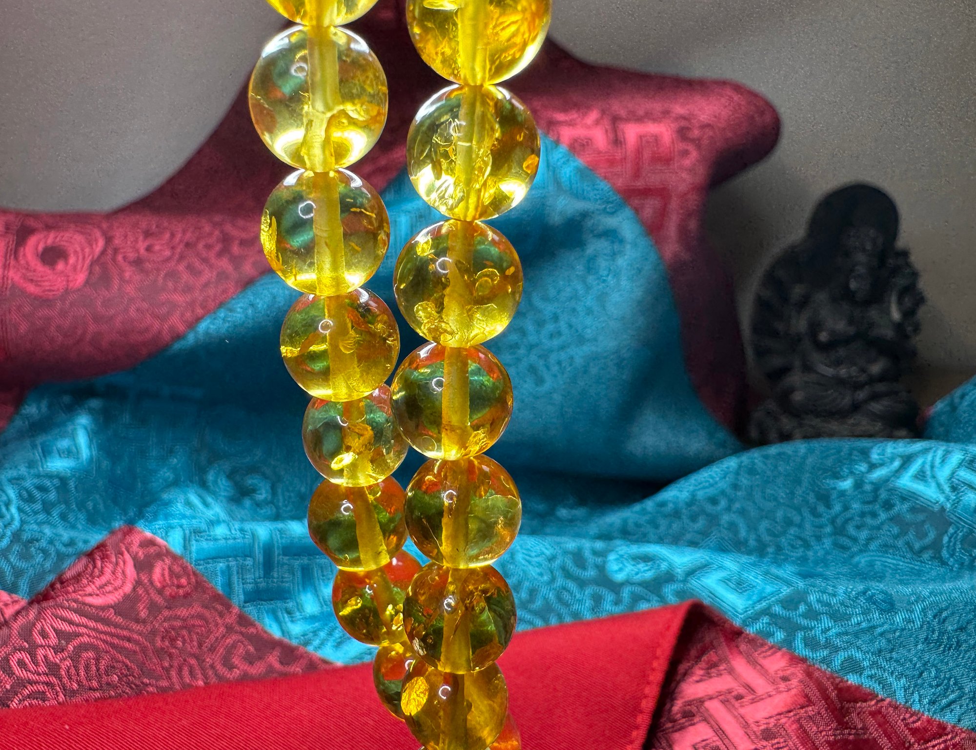 The color tone is a lovely Honey Yellow and is very unique. In sunlight or backlit with a lamp, you can see the smokey quality of the beads. There are some beautiful swirls and some deposits which give this mala a beautiful natural and organic appearance. The feel of the mala is delicate and smooth as is the nature of amber.