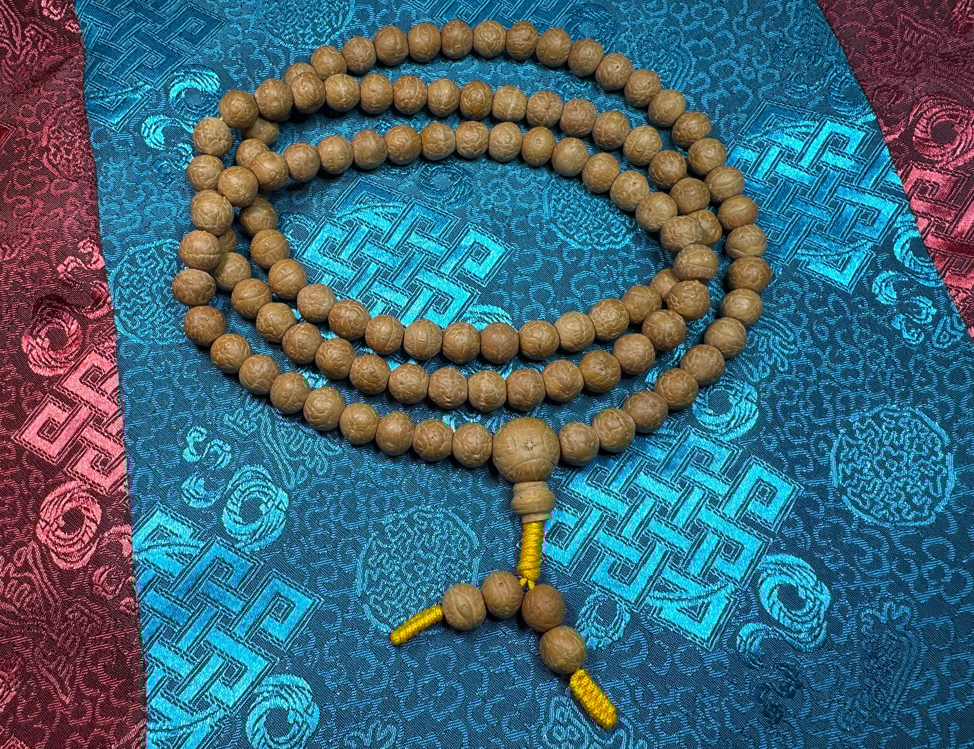 This is a very rare Bodhi Seed mala from the small village of Timal in Central Nepal located about 5 hours southeast of Kathmandu by car. This year I was able to return and visit the Yarinak cave where Padmasambhava stayed and practiced. It was said Guru Rinpoche, on his journey back from Tibet, meditated there before moving to Pharping at Asura cave. Timal, Nepal is connected with Guru Rinpoche himself when he taught that Bodhi Seeds should be used for counting mantra. Additionally, it is said Padmasambhava defeated Tirthikas—sworn enemies of the Dharma near Yakinak cave. Afterwards he blessed the lands of this area. Over time the Bodhi Trees and the seeds of Timal have become deeply connected to Guru Rinpoche.
