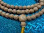 This Timal Bodhi Seed mala is one of the few I was able to hand pick from a resident of Timal, Nepal. The beads are sized 11mm on average. This is an exceptionally well crafted Timal Bodhi Mala. The seeds have an even and consistent light brown/tan color tone (best seen in image #4) and the shape of the seeds are uniform and round. The integrity of the seed are very high and strong and it is laced with a 1.2mm golden yellow nylon braided cord. Additionally, this mala is in it's natural state as the seeds are not oiled and therefore, reflect their natural organic color. Finally, this mala has a 4-Eye Bodhi Seed guru bead and is finished with a sliding knot, 4 decoration Bodhi Seeds (2 on each cord end), and braided cord tails.