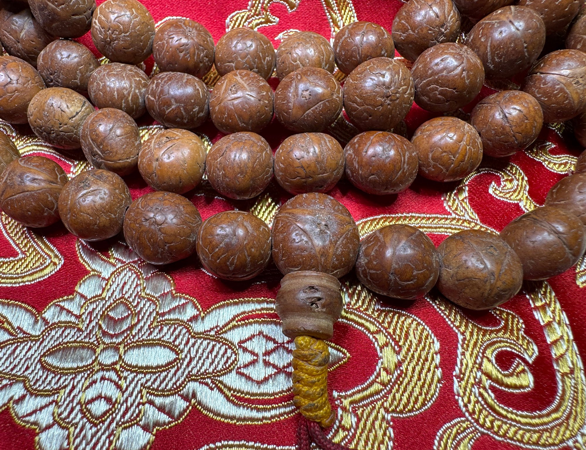 This mala is one of the few I was able to hand pick while I was in Timal in from a local resident craft person. See the last image of me at the gateway to Timal, Nepal. This is an rare high-quality Timal Bodhi Mala as all 108 seeds are 3-Eye. This is not very common overall and even more rare being harvested in the small village of Timal.