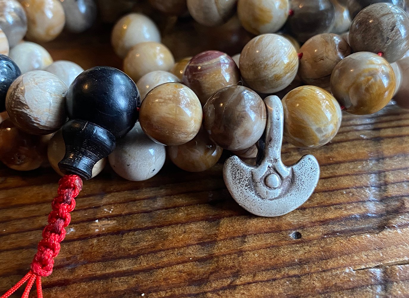 For sizing reference this Bhum Counter is placed on a Mala of 8mm petrified wood beads. Mala is not included with this purchase.