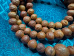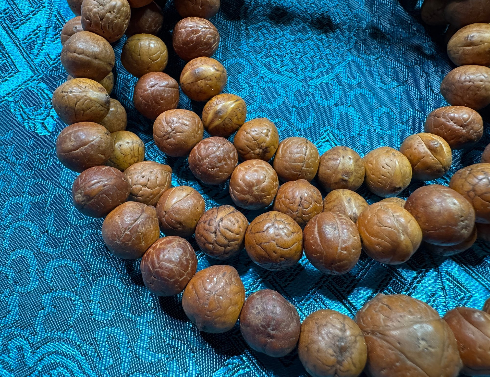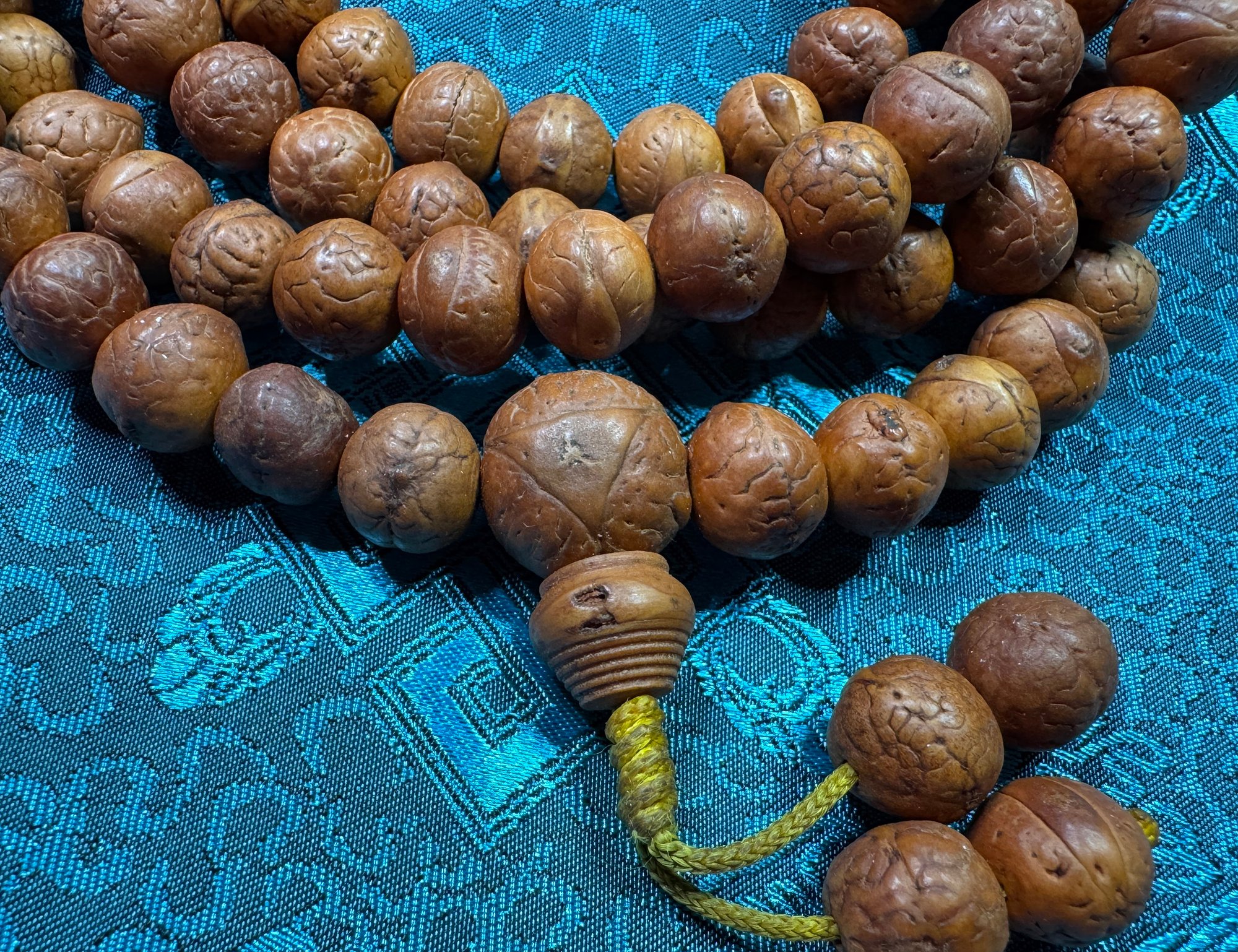 This Bodhi Seed Mala has a even medium brown consistent color. The guru bead is a classic three-eyed Bodhi Seed. I picked this up right outside the Asura Cave doorway near Pharping, Nepal from a local seller. I have been acquiring Bodhi Seed malas from this seller for the past 4 years. He is a very sweet man I am happy to offer this mala.