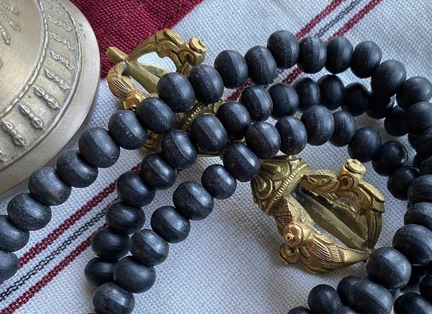 The Mala is finished with a 12mm Yak Horn Guru Bead and and black satin nylon cord. The cord is tied off with a sliding knot. This will allow you to adjust the slack as needed. Additionally, it makes it easier to add and move Mala Counters and Bhum Counters. The Mala is about 17 inches or about 43 centimeters.