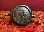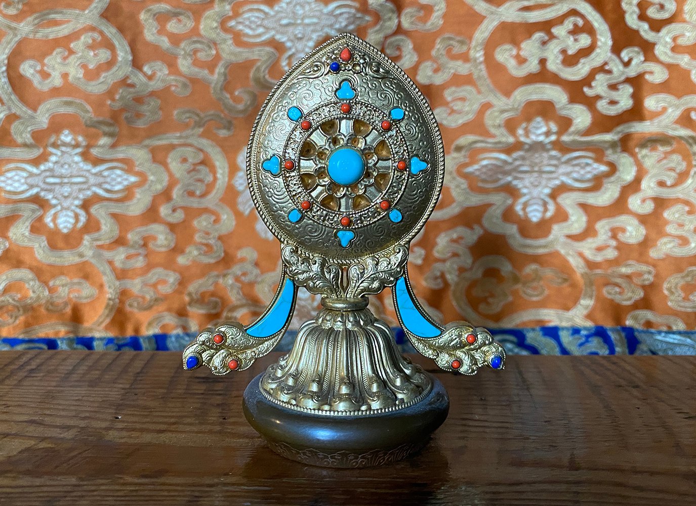 Dharma Wheel Statue • High Quality Ornate Detail • Inlaid Stones • 10.5cm Tall
