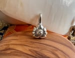 Offered is a medium sized "Lotus Design" Bhum Counter made from high quality 925 sterling silver. At the center is a smaller detail expressing the Three Jewels of Buddhism. This is the first time I have been able to offer this style of Bhum Counter. The all silver look to this Bhum gives it a very strong and clean look. These are used to mark location on your Mala and keep tract of hundreds of thousands and millions of mantra. These are often referred to as million marker counters.