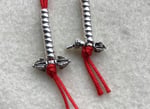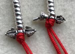 The bell is 15mm and the dorje is 16mm in length. The cord is a single loop of braided nylon. The cord color options are RED, YELLOW, BLACK, BURGUNDY, AND GREEN. Please select the color when you make your purchase. This makes the perfect gift or offering.