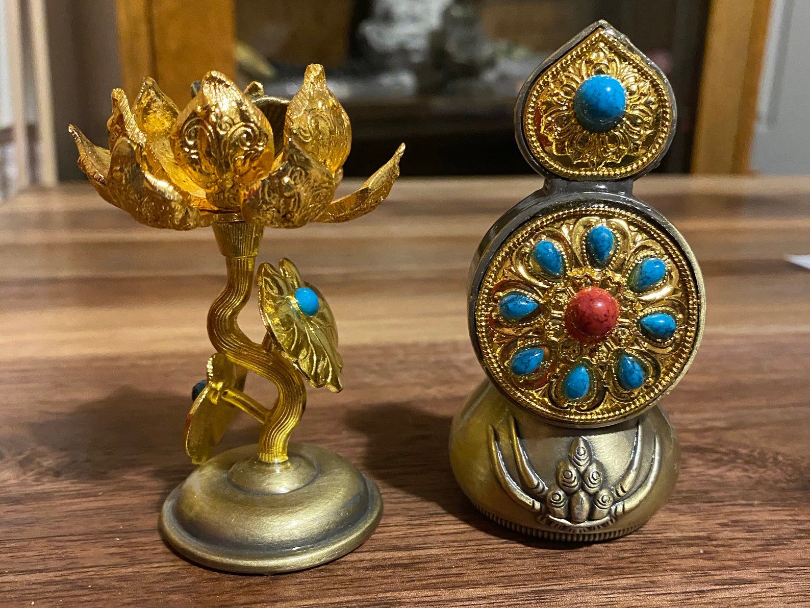 Tibetan Buddhist offering for your Home Shrine or Buddhist Center. These are very high quality items. Extremely well made and beautiful. Both will add beauty and sincerity to your shine and be a great support to your practice.