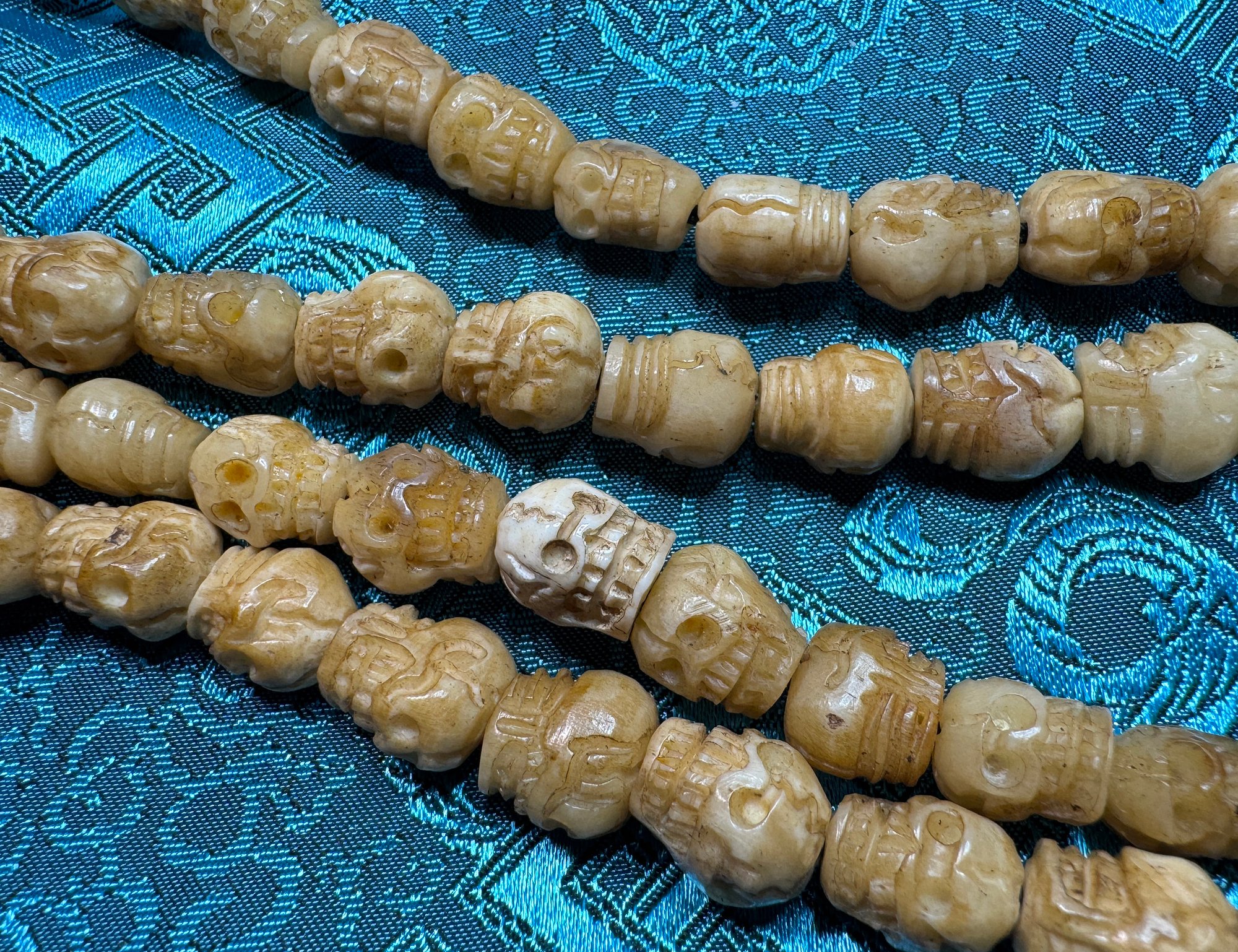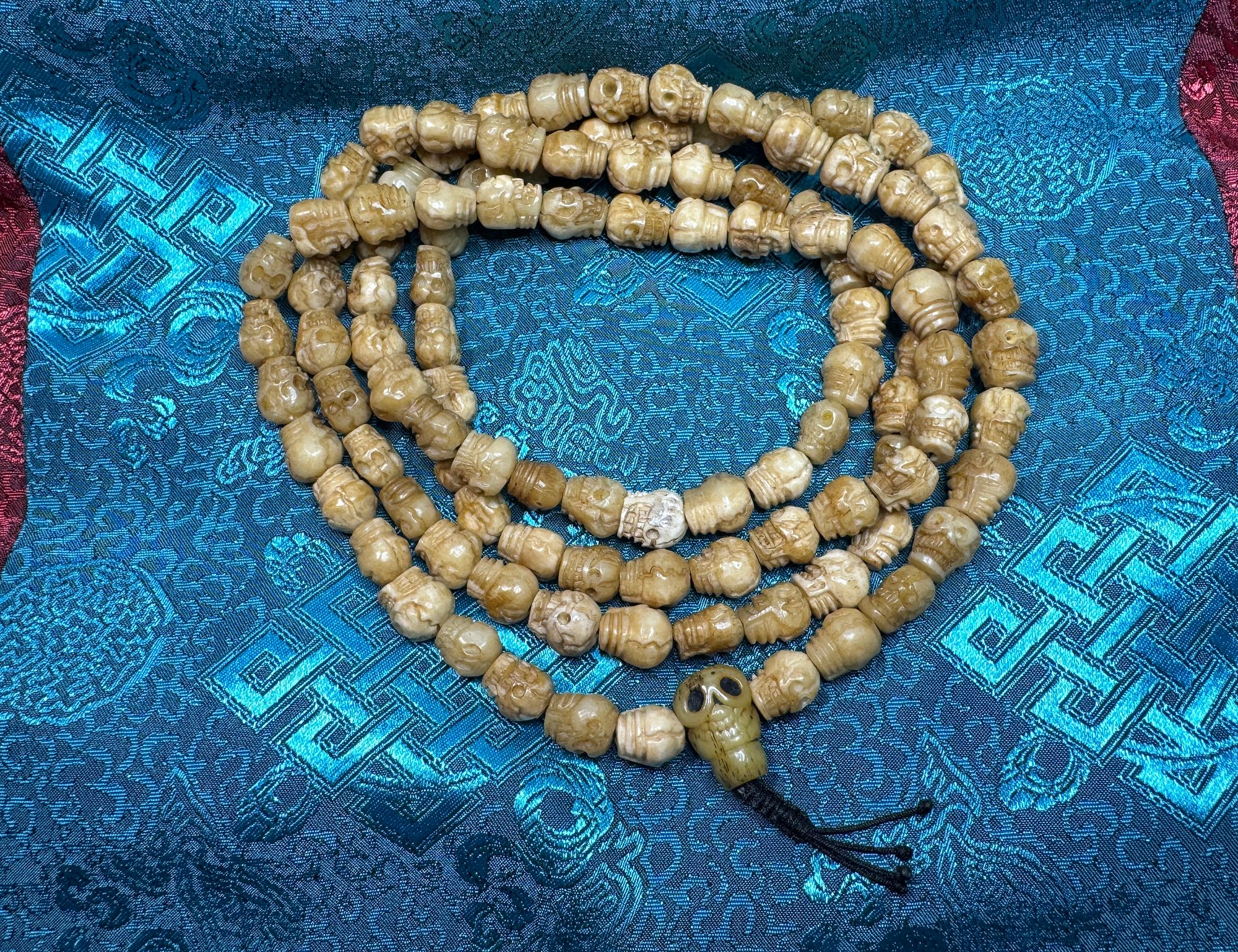 This is a 108 bead Yak Bone skull carved Citipati mala with a Yak Bone Citipati Guru Bead that compliments the look and feel of this mala. This a rare high quality item that was hard to find. I picked this up from a shop owner in the Boudhanath Stupa area of Kathmandu while on Pilgrimage in March 2024. The skull beads are hand carved, elegantly detailed, and very unique with a light beige to tan-ish coloring. They vary a bit in color, size, opacity, and form. And there are a few strikingly white colored beads which adds unique contrast. However, all 108 beads are carved into small human skulls from Yak Bone. This mala is finished with a unified Citipati Buru Bead.